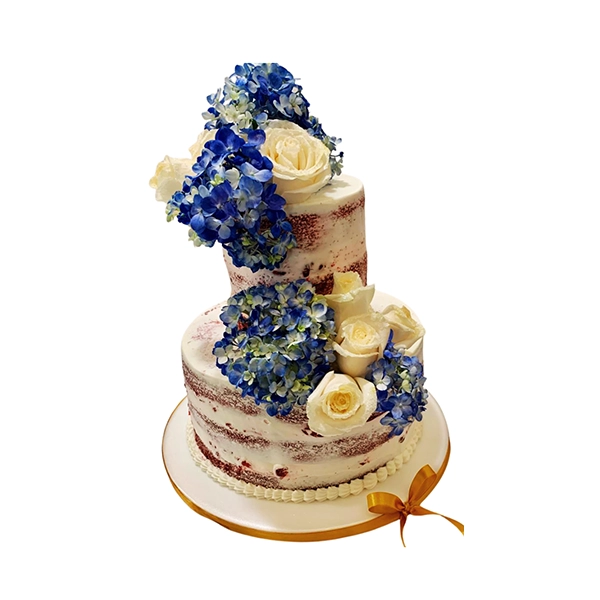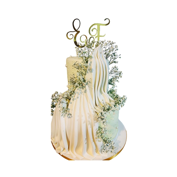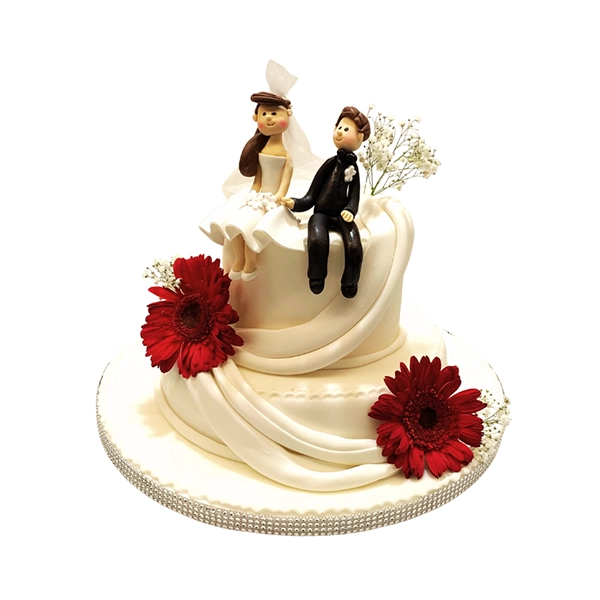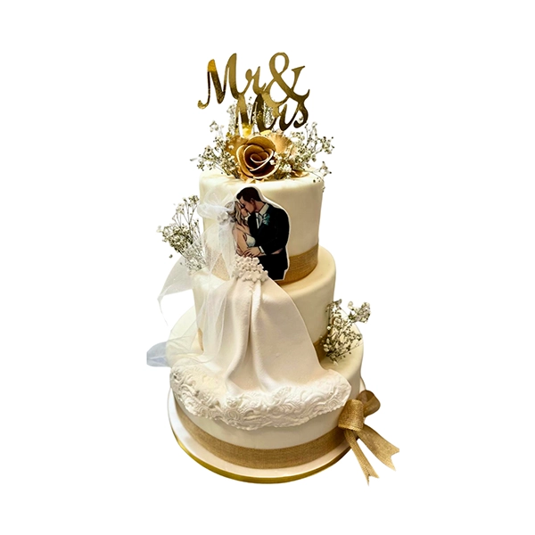 Torta de boda divertida y original, decorada con flores y elegantes detalles en color dorado. En la cima, una simpática pareja de novios roba todas las miradas: la novia aparece con el novio “amarrado”, como si lo hubiera secuestrado, aportando un toque de humor y complicidad al diseño. Ideal para parejas con personalidad, que disfrutan reírse del amor y celebrar su unión de una forma única y memorable.